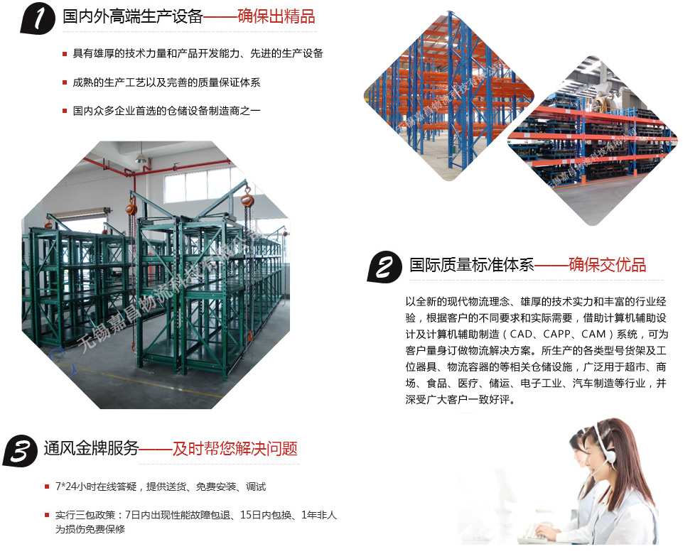 無錫嘉昌倉儲貨架有限公司主要產(chǎn)品有:鉚釘貨架、角鋼貨架、中型貨架、重型貨架、懸臂式貨架、流利式貨架、重力式貨架、壓入式貨架、模具架、閣樓貨架、鋼平臺、密集架、線棒架、自動(dòng)化立體倉庫貨架以及周邊配套設(shè)施(托盤、周轉(zhuǎn)箱、倉儲籠、堆垛架、物流臺車、零件盒、工具車、工具柜、工作桌、文件柜、更衣柜、小推車、輥道輸送線、網(wǎng)片隔斷、液壓升降平臺以及液壓搬運(yùn)車等)。